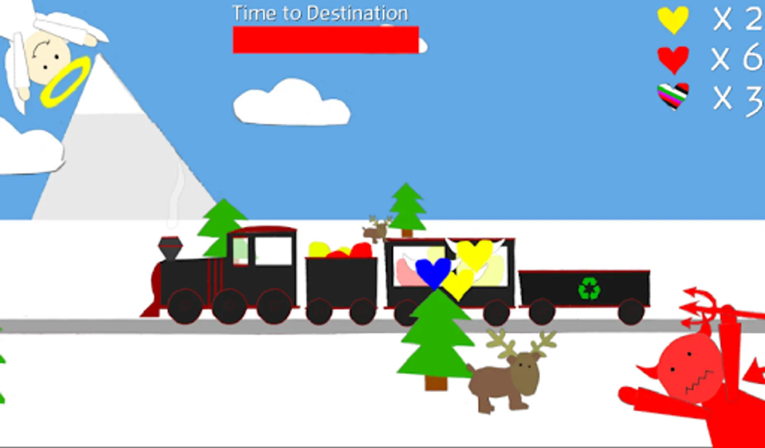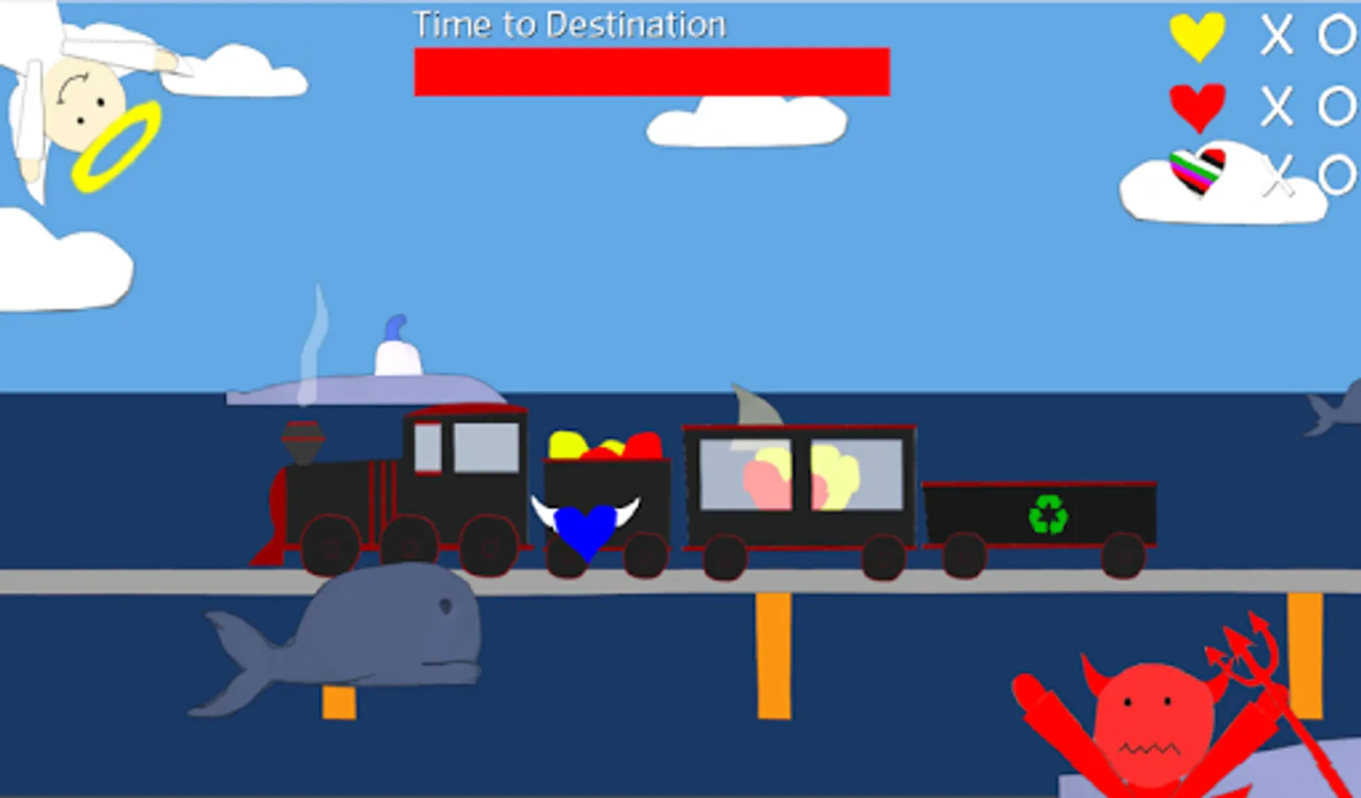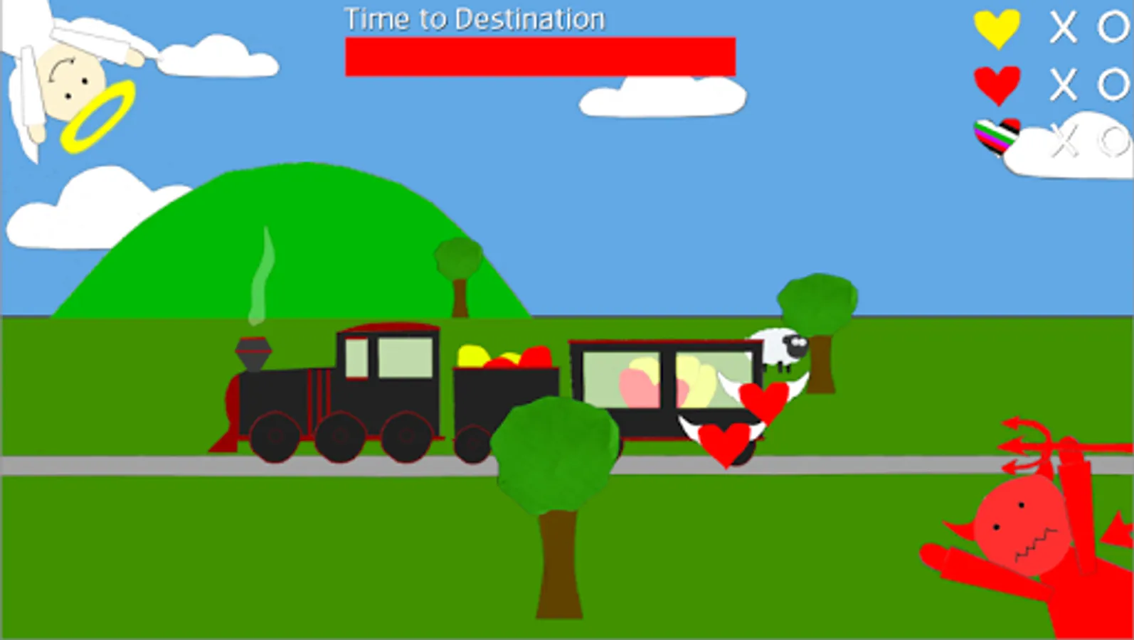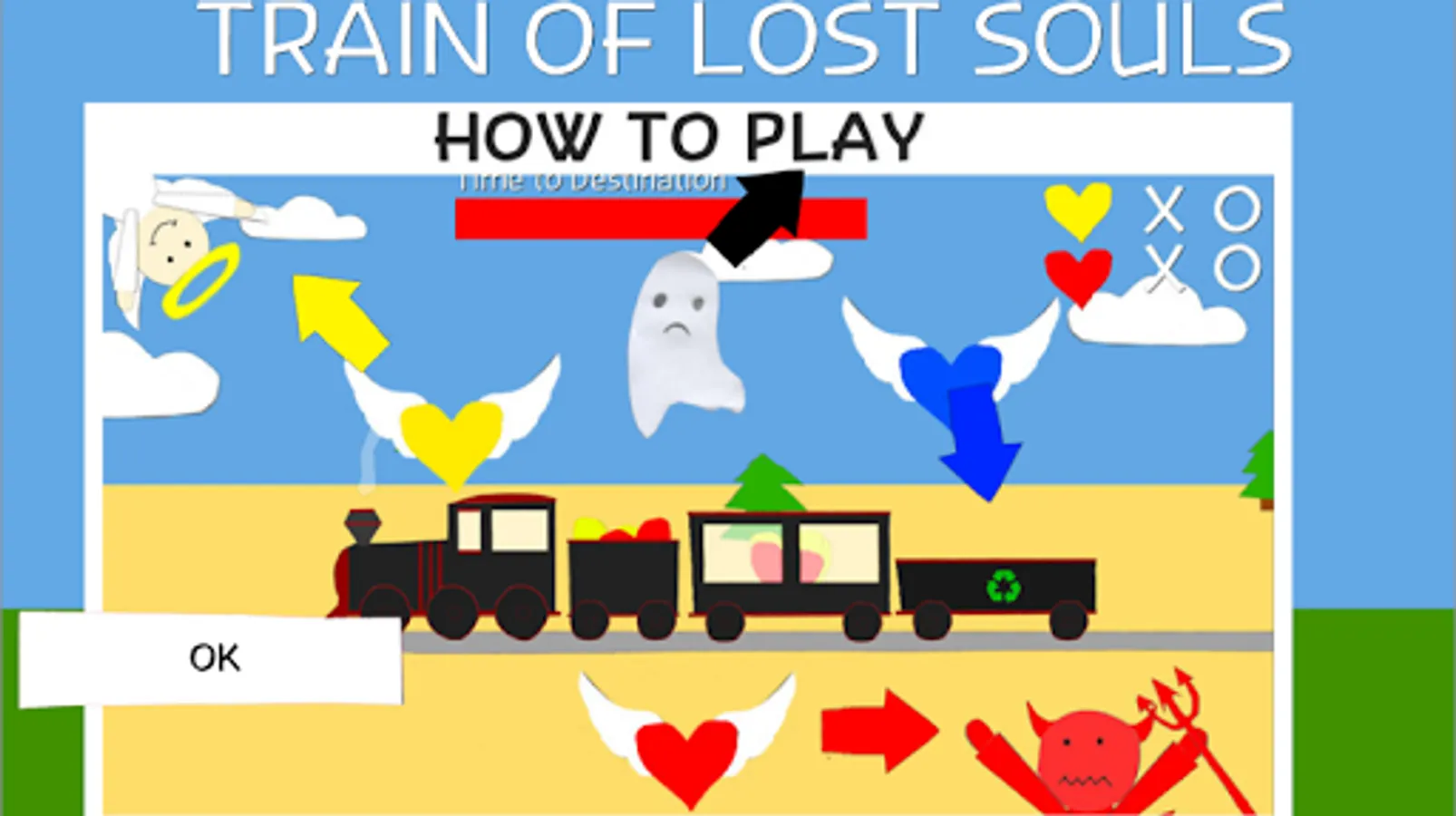 As the souls are released from the train, swipe them to their rightful place. Swipe the gold souls up towards the angels and the red souls down towards eternal damnation. Some souls are not ready, so need to be put back in the train, luckily the train has a recycling wagon where the unready souls can be swiped back into the train.