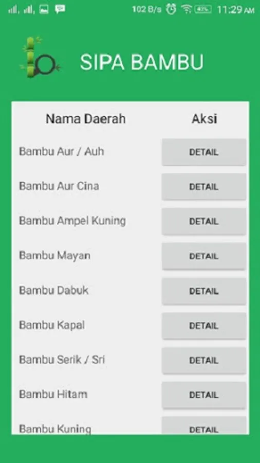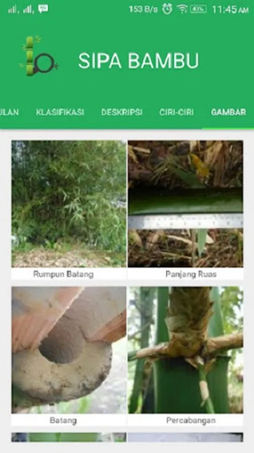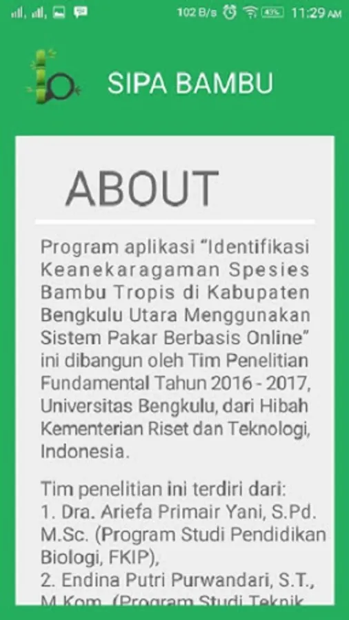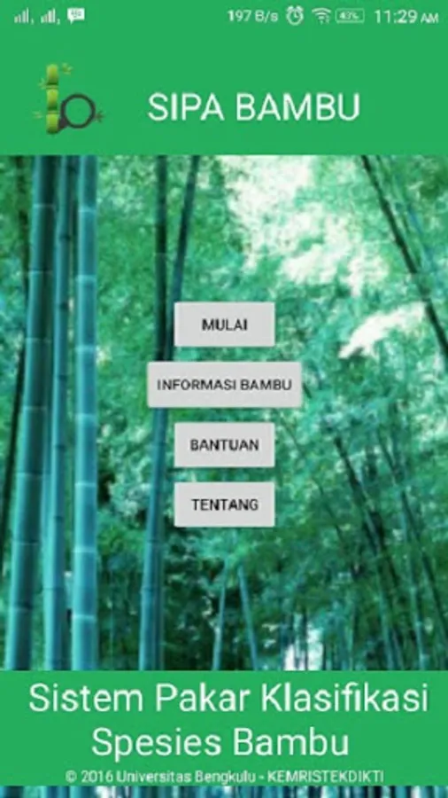 The application program "Identification of Tropical Bamboo Species Diversity in North Bengkulu Regency Using an Online-Based Expert System" was built by the 2016 - 2017 Fundamental Research Team, Bengkulu University, from the Ministry of Research and Technology Grant, Indonesia.