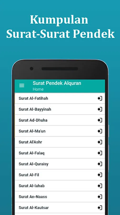 Al Fatiha, Al-Ma`un, Al-Asr, Al-Falaq, Al-Qadr, Al-Bayyinah, Adh Dhuhaa, Al Quraish, Al Fill, Al Lahab, An-Nas, At Takatsur, Az-Zalzalah, Aalam Nasyrah , Al Kawthar, Al-Ikhlas, Al-Kaafiruun, Al-Humazah, Al Qaari'ah, Al-Aadiyaat, al-Tiin.