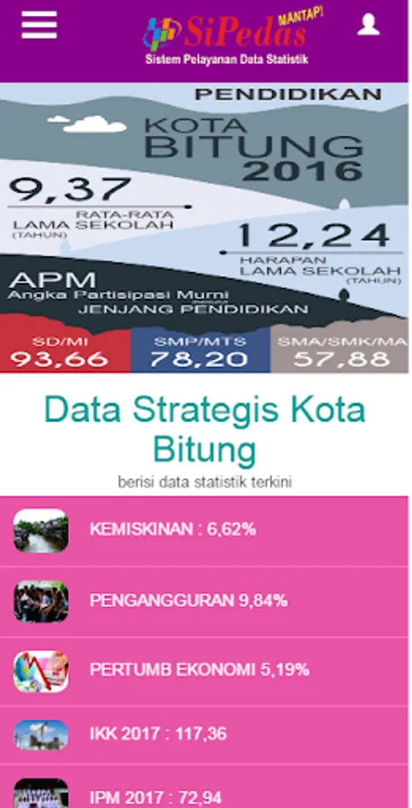 Bitung-SIPEDAS Sweet! is a Service System Statistics Safe, Right and Fast administered by BPS Bitung. Bitung-SIPEDAS Sweet! is a replication of SIPEDAS Steady! with the addition of more interesting features. Application-SIPEDAS Bitung Sweet! displays features of strategic data from BPS Bitung, infographics galleries, libraries, statistical consulting, and BPS websites list