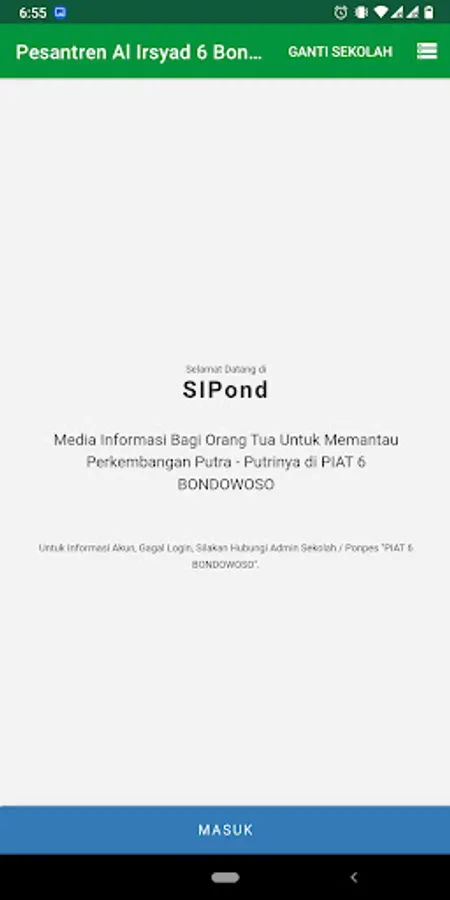 The PIAT6 application is an application for parents and guardians of students at the Al-Irsyad 6 Bondowoso Islamic Boarding School. Information in the form of tahfidz development, achievements, tuition fees, pocket money, grades, boarding, violations, and others.