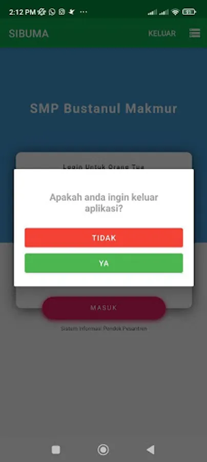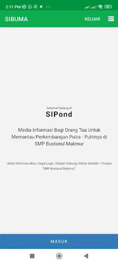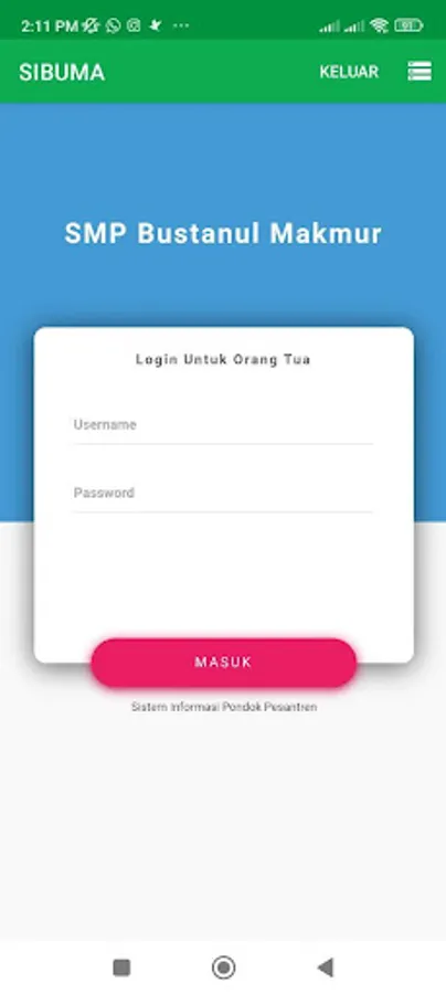 Sibuma is an information system application provided for parents/guardians of students that makes it easier to monitor their children at Bustanul Makmur Genteng Middle School. This application contains some information such as tahfidz, achievements, grades, tuition fees, boarding, violations, pocket money and so on.