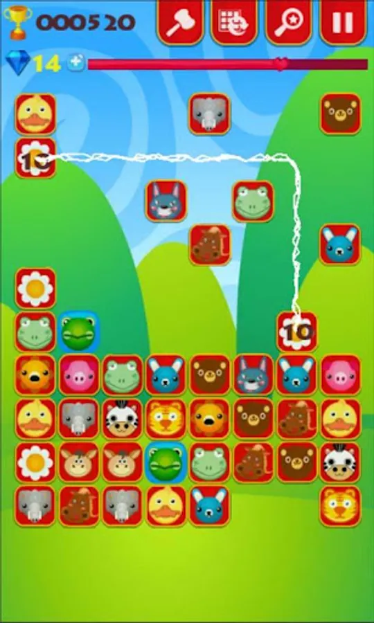 Getting rid of two blocks with the same Cartoon Animal by linking them with less than 3 lines.