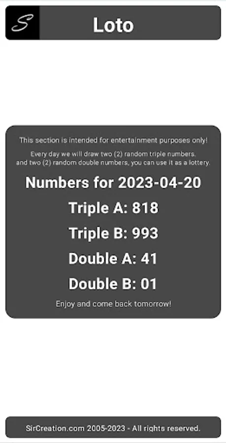 Daily random triple and double numbers just for fun, can be used as lottery.