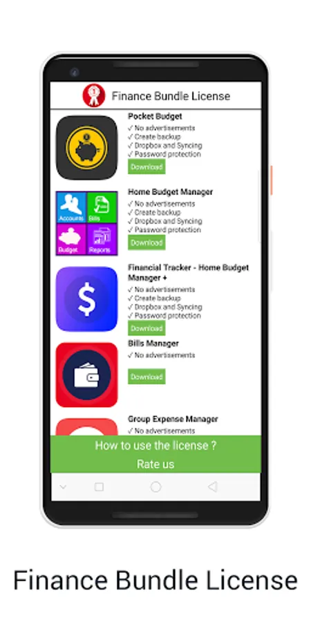 Finance Bundle License unlocks all features and removes ads in Home Budget Manager, DailyMoneyManager(Home Budget Manager +) and Bill Manager. It is necessary to keep this application installed along with other application.