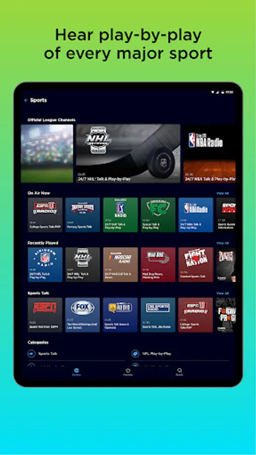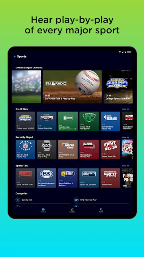 - ESPN Radio, CBS Sports Radio, FOX Sports Radio, and NBC Sports Radio in just a few taps