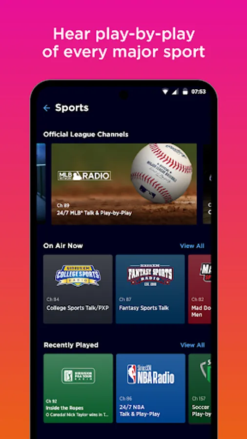 - NFL, MLB®, NBA, NHL®, and NCAA® play-by-play, NASCAR®, plus the biggest names in sports talk