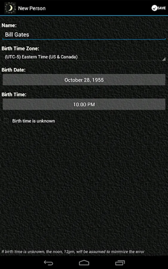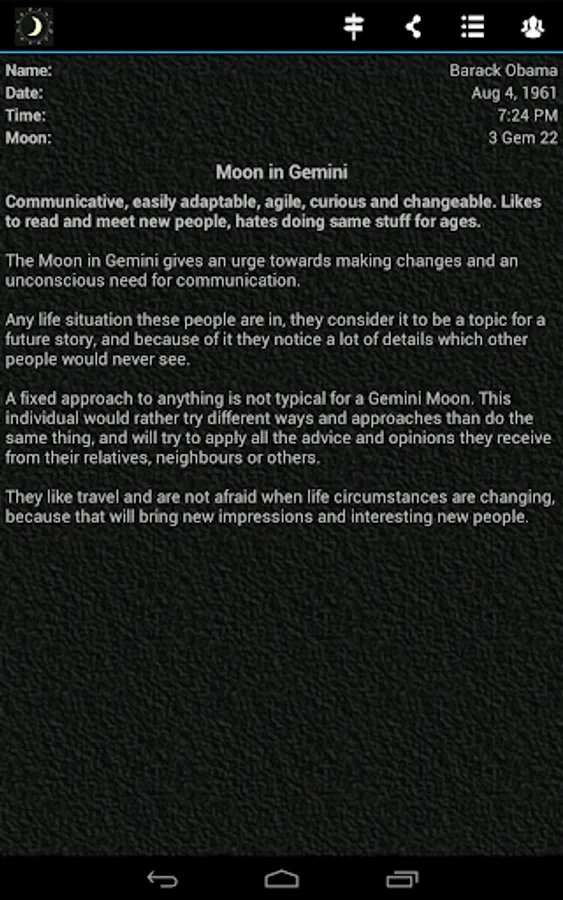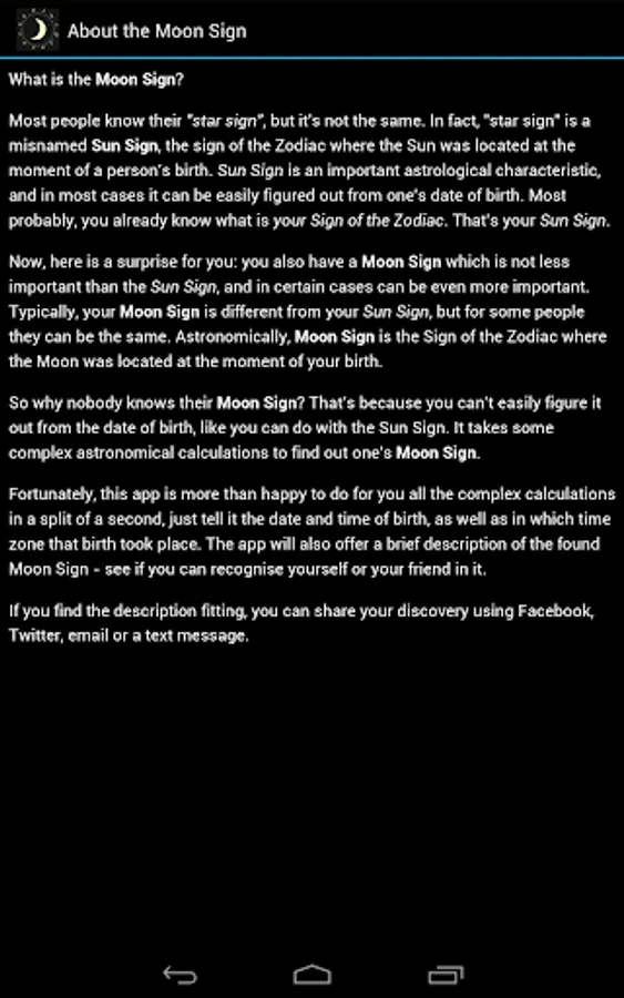 Fortunately, this app is more than happy to do for you all the complex calculations in a split of a second, just tell it the date and time of birth, as well as the location where the person was born. If the time of birth is unknown, the app will either tell you that the Moon Sign is certain anyway, as the Moon remained in the same sign on the date of birth, or it will inform you which two signs are possible candidates, and which part of the day belongs to each of them. You can then decide which of the signs is the most appropriate by reading their descriptions.
