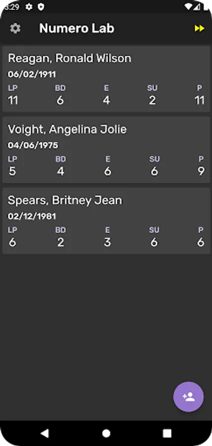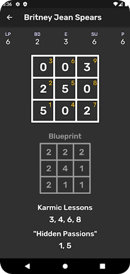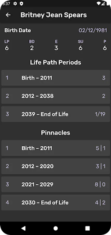 To determine the numerological parameters for the person you are interested in, create an entry for him or her (after clicking on the button in the lower right corner of the screen). Enter the person's first name, middle name, and last name (or at least the first name), as well as the date of birth. After the new entry appears on the main screen, touch it and you will see all the main numerological parameters for this person. The numerological core is discussed in detail in my introductory course, while all other parameters will be discussed in the coming courses.