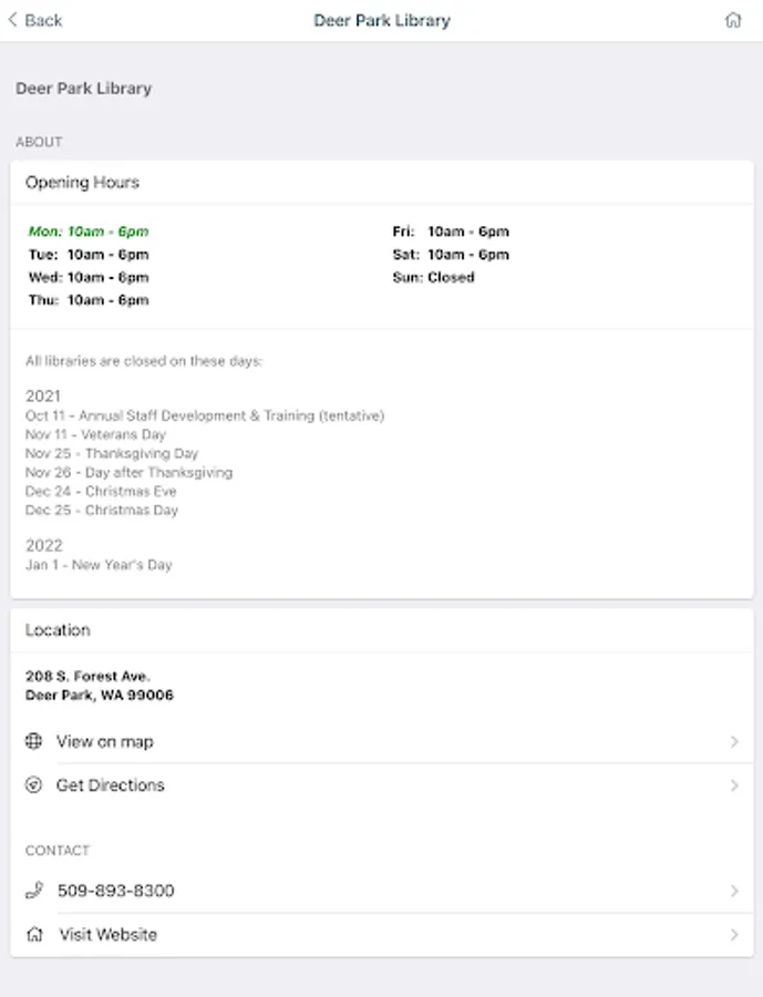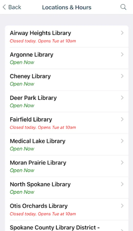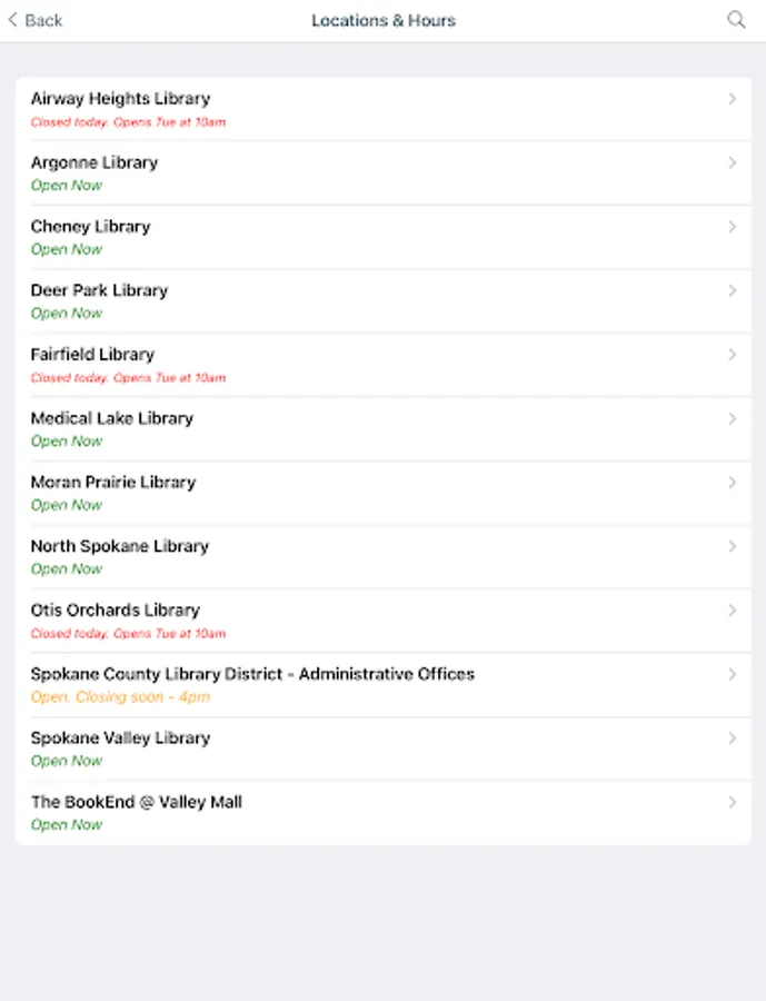 – Get location information and hours for our 11 full-service libraries: Airway Heights Library, Argonne Library, Cheney Library, Deer Park Library, Fairfield Library, Medical Lake Library, Moran Prairie Library, North Spokane Library, Otis Orchards Library, Spokane Valley Library, and The BookEnd at Spokane Valley Mall.