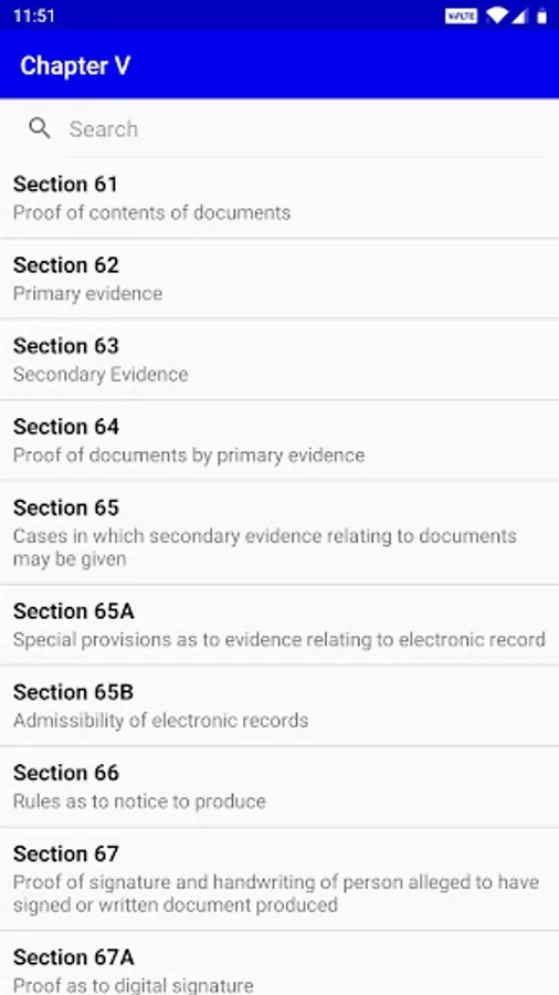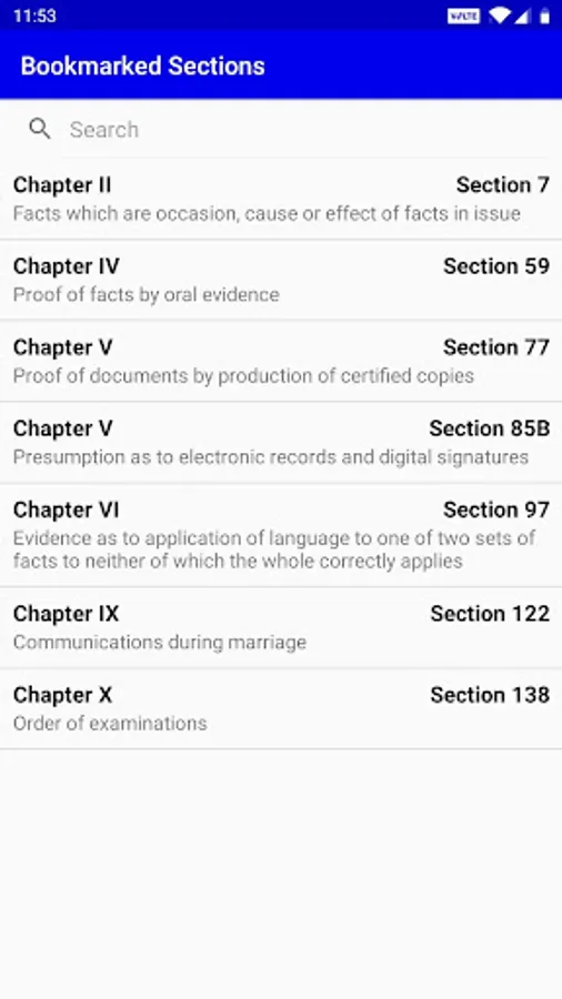 • Optimized Search options to retrieve information pertaining to any chapter name/number/contents or section name/number/contents of Indian Evidence Act.
