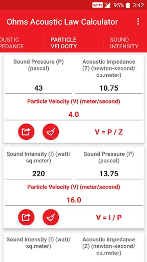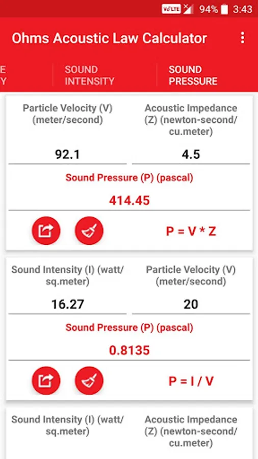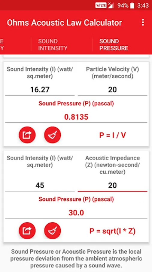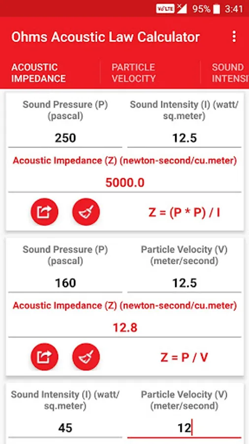 Ohms Acoustic Law Calculator provides the best way to calculate Acoustic Impedance, Particle Velocity, Sound Intensity and Sound Pressure. Automatic and Accurate Calculation. Calculated values and results can be shared to social media, mail, messages and other sharing apps. Formulas and Definitions are provided with all calculators.