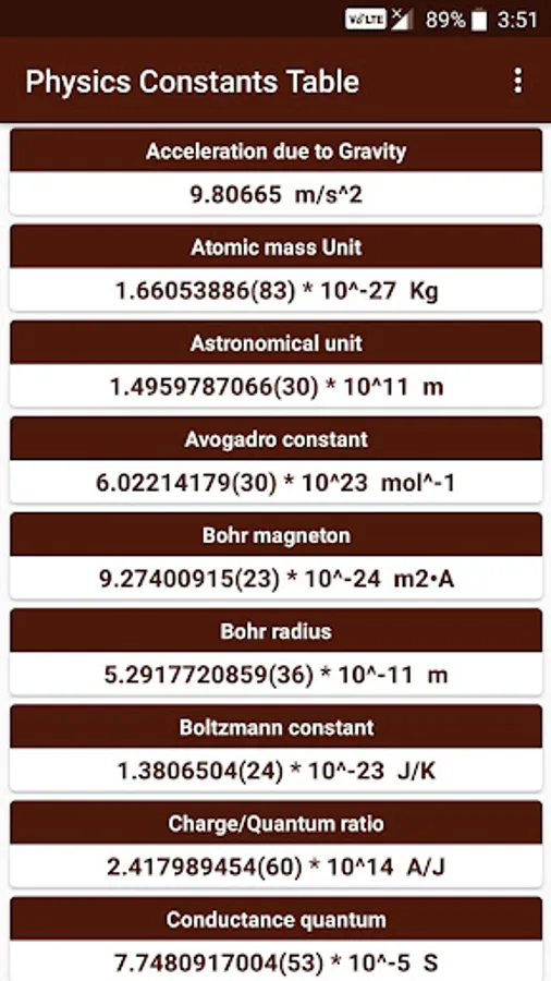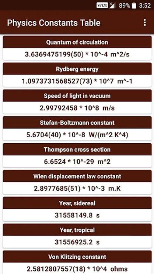 Physics Constant Table provides the important physics constants in a table format. Professional user interface with pleasant presentation. A highly useful educational & engineering utility.