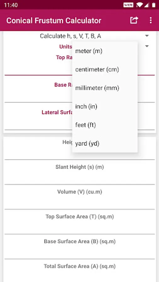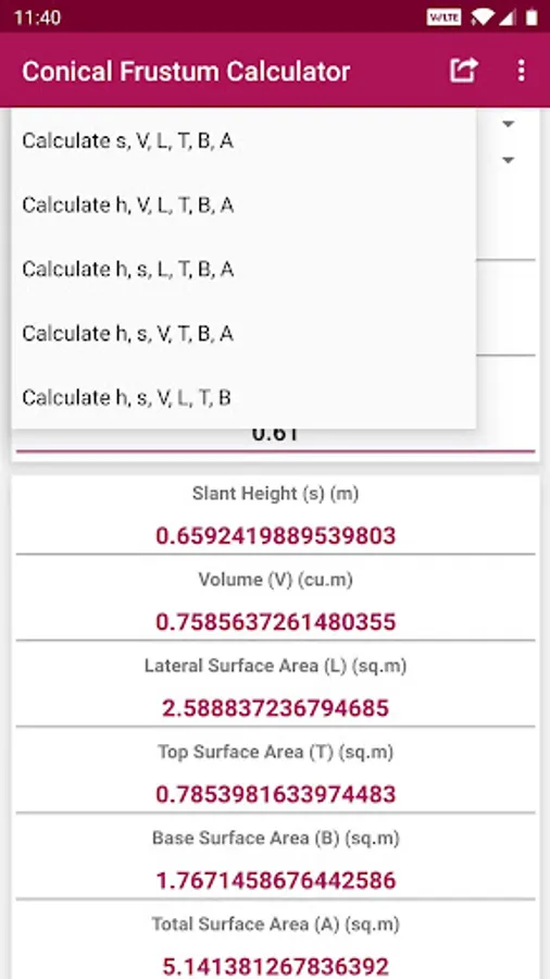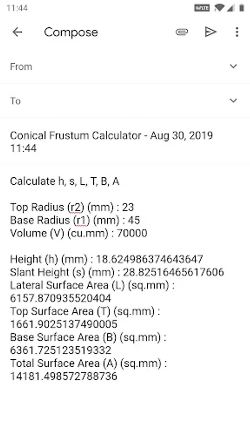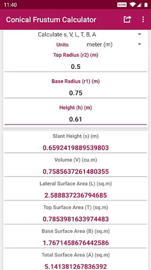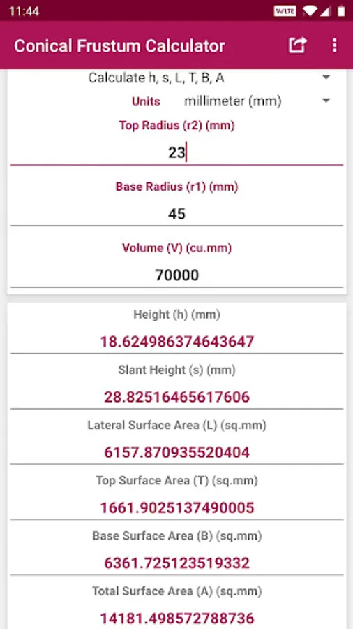 Conical Frustum Calculator helps you to quickly and easily calculate different parameters of the conical frustum. Automatic & accurate calculations.