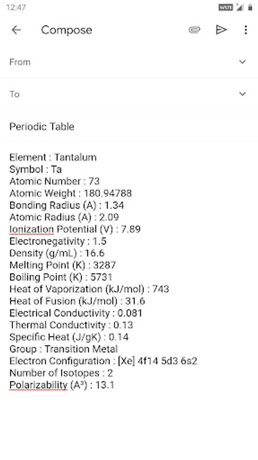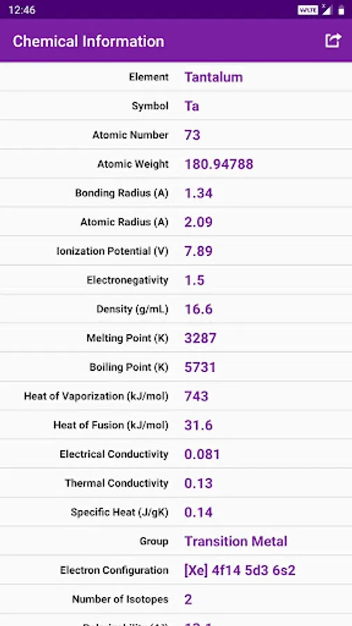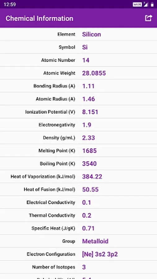 All the chemical information about each and every element can be shared to social media, mail, messages and other sharing apps.