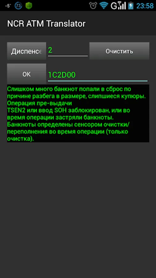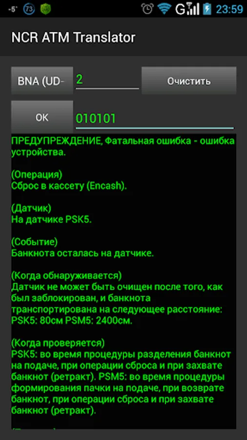 The program is designed to receive information about errors that occur during the diagnosis and repair of the dispenser and bill acceptor BNA, GBNA, BRM.