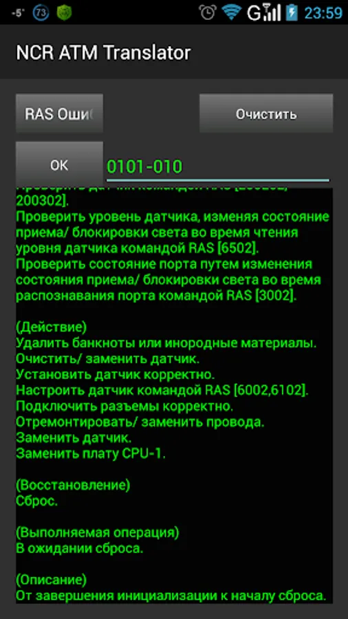 Information about errors is presented in Russian with an extremely clear description of the malfunction and ways to solve it.