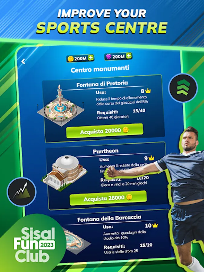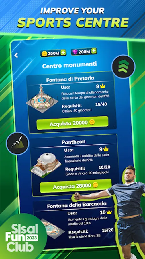 Use coins to buy buildings and monuments to increase your football club’s fame. Expand the stadium, offices, training grounds, amusement park and player infirmary: They will all produce coins even while you are offline! Every time you go back to SisalFunClub, all you have to do is tap on each building to collect the coins it has produced up to that point in time!