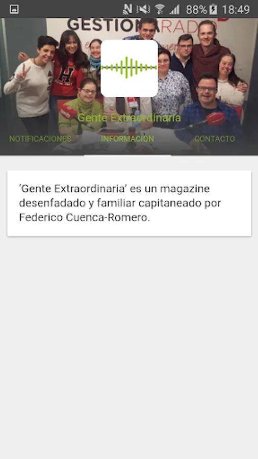 "Extraordinary People" is a radio program, conducted by a group of young people from the Down Syndrome Foundation of Madrid (Down Madrid) and led by Federico Cuenca-Romero. Every Saturday from 14 to 15 hours, this team makes available to listeners of Radio manages their "different abilities" to conduct interviews with people in the news, comment and make news reports.