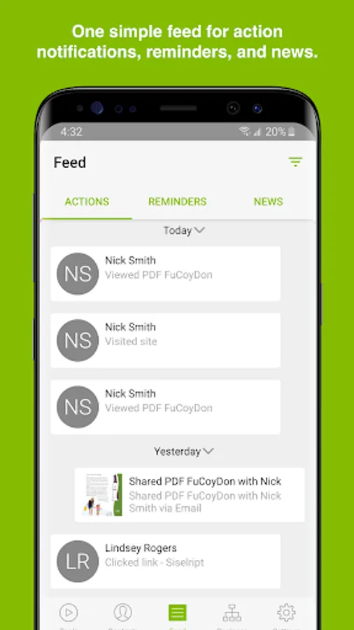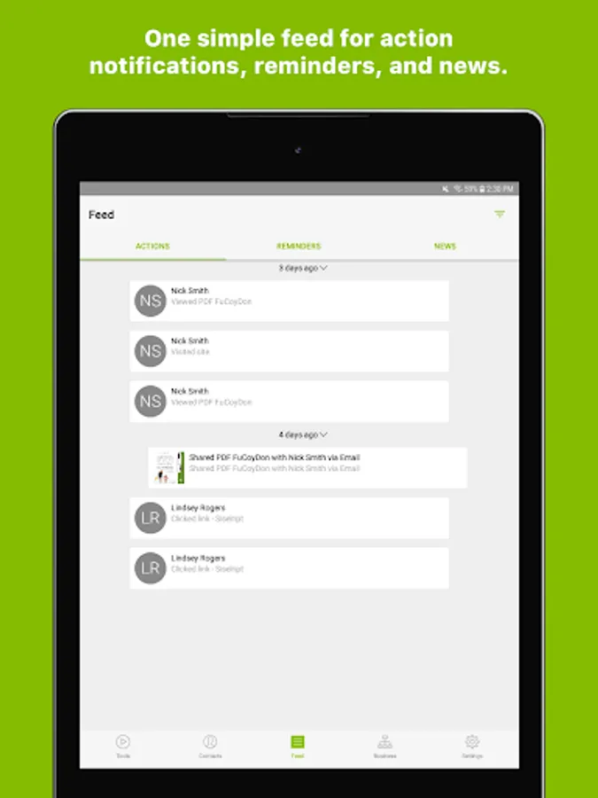 Feed: Keep track of everything you’ve shared and see what your contacts have viewed with notifications. You can even swipe notifications to mark them as a Reminder. News also brings all of the latest announcements and social posts from corporate straight to you in one convenient place!