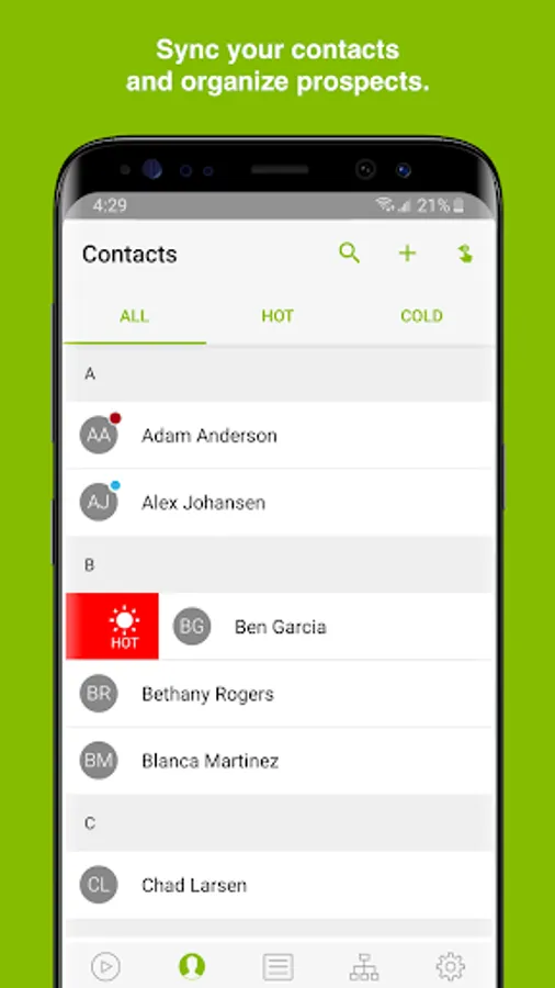 Contacts: Choose how to sync and manage your contacts. Swipe to sort them by interest level. You can make connections, add notes, or check out the Contact Feed to see the tools you've shared and contact actions.