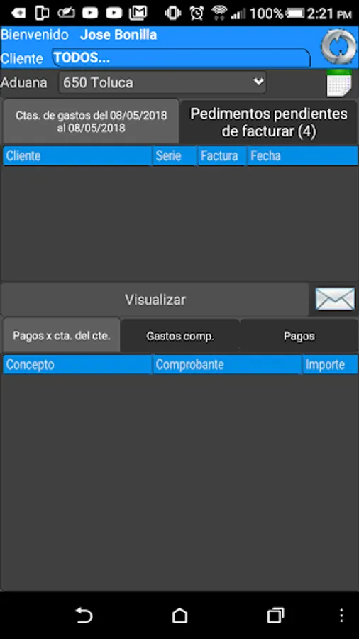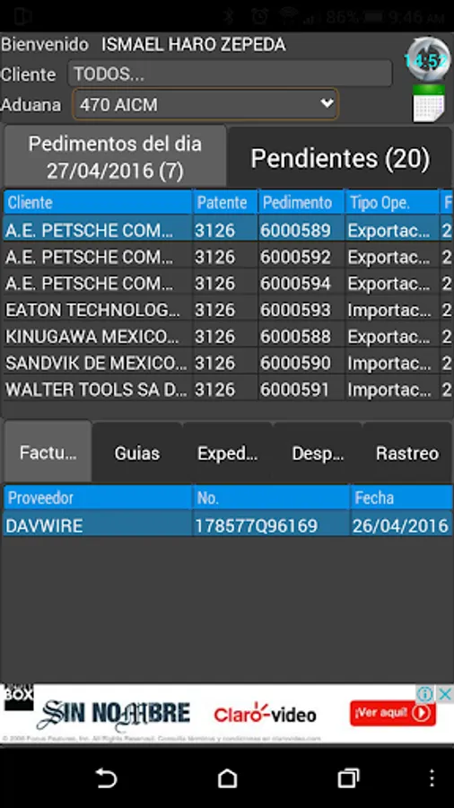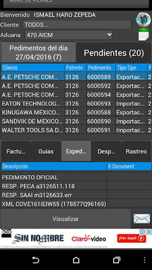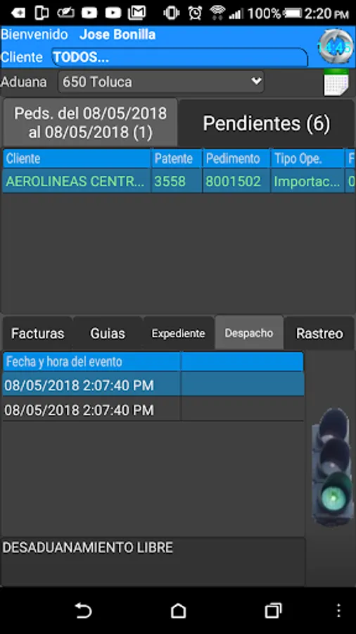 Check the motions paid the day, you will see the invoices, guides, PDF (Motion, Letters, Photos, Etc.) to the Customs Office (Green / Red) and Status of capture file.