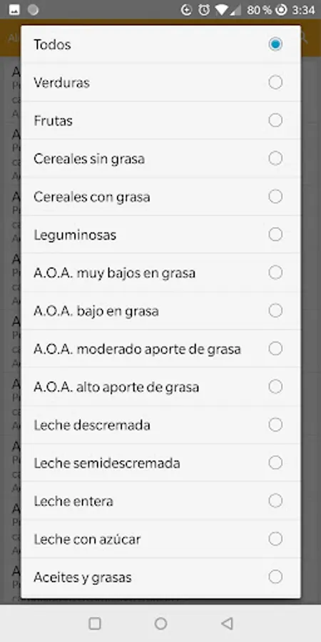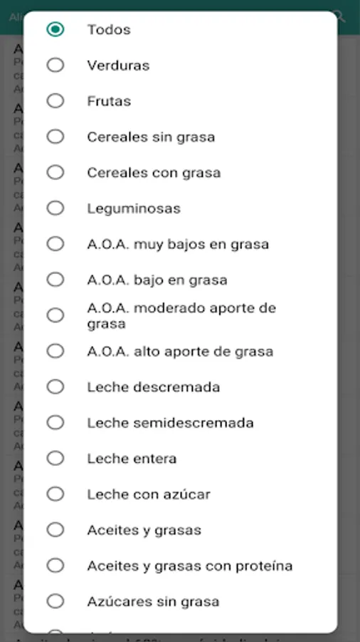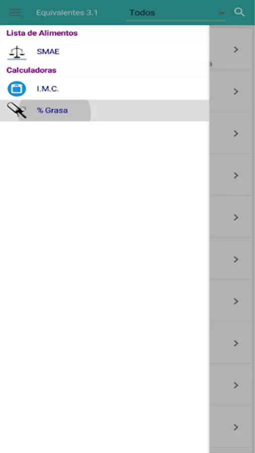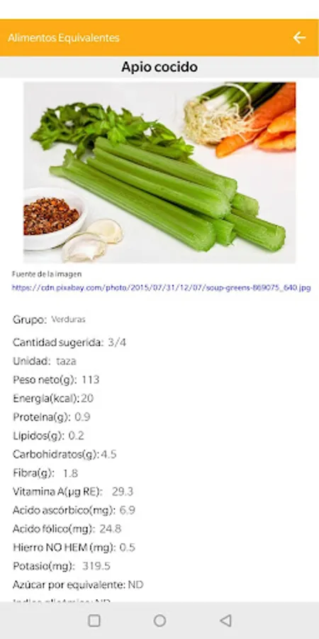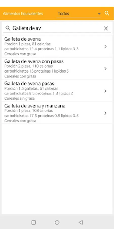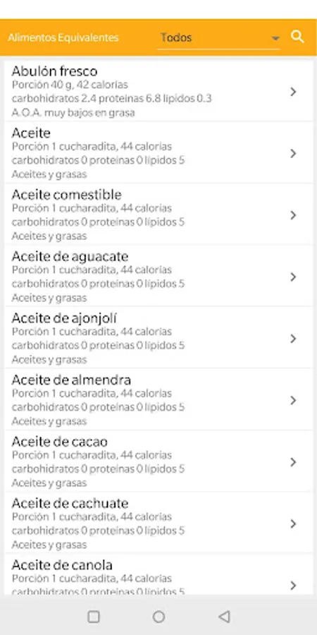 The application shows the equivalent foods of the SMAE (Mexican System of Equivalent Foods) 4th edition, as well as the portions, calories, carbohydrates, proteins, lipids and the group of each food.