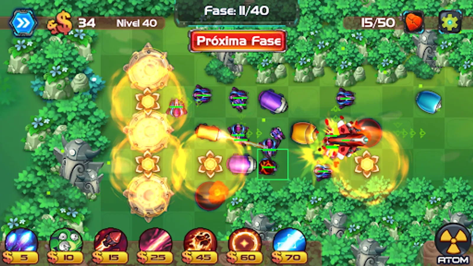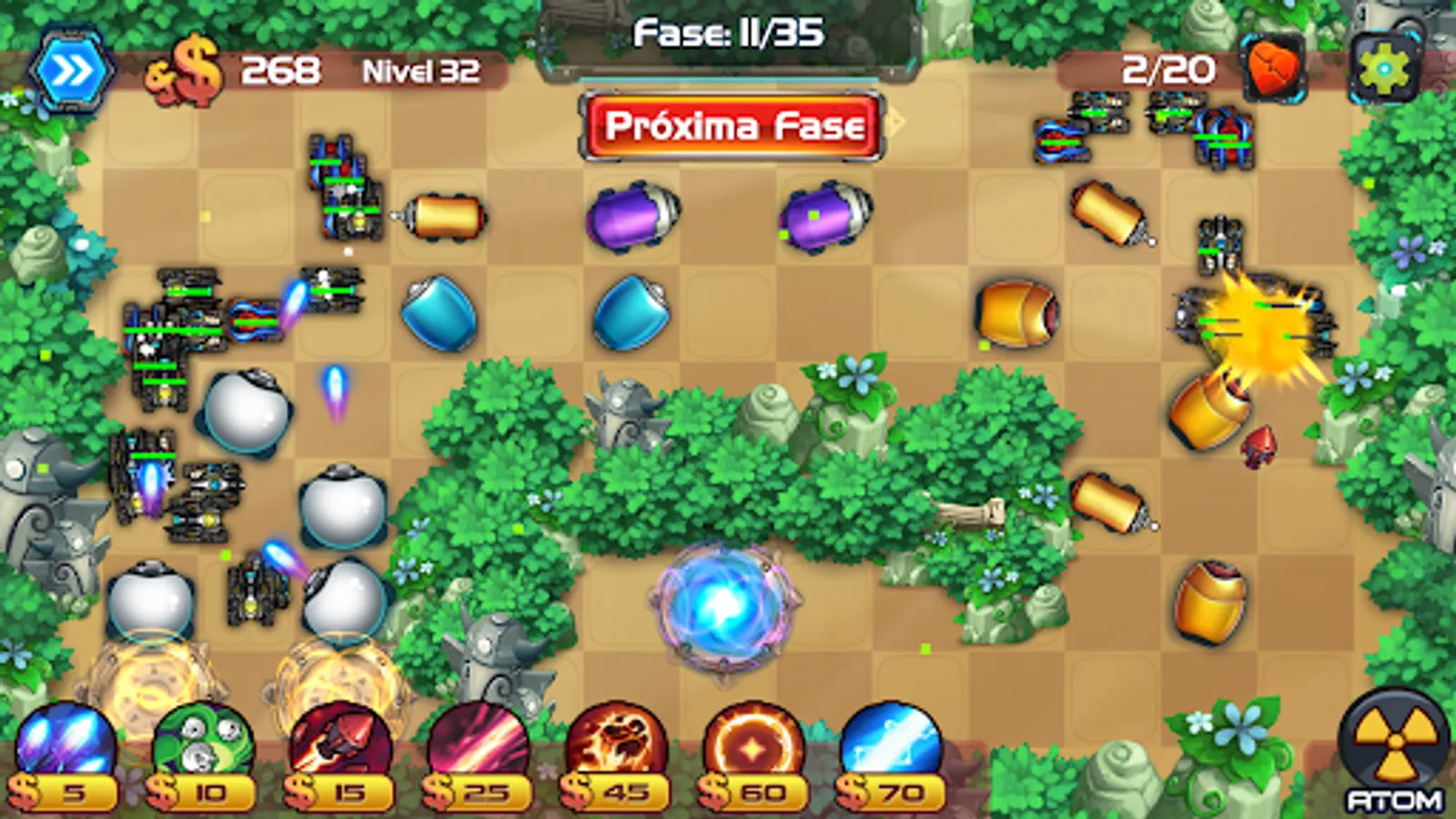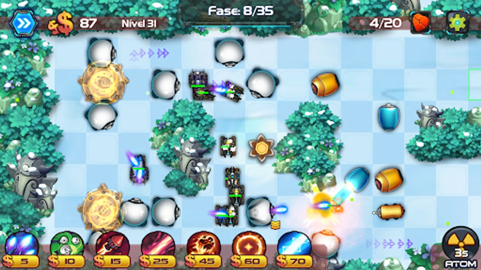 As you progress, the number of enemies increases and so does the difficulty. But don't worry, you'll have access to new defenses, each one more powerful and more impressive than the last, and you'll be able to perform improvements on existing defenses, making them more powerful and effective.
