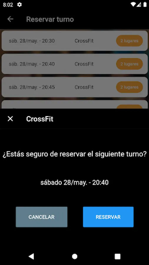 To book, click on the "Book" option and you will immediately see the list of shifts that the gym has. If it takes place, press the "+" sign and confirm the reservation.
