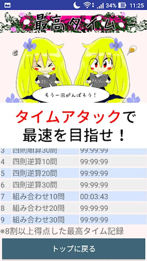 計算力はスピード勝負になります。なので本アプリにも時間計測機能を用意しました。それぞれの回答速度と、最終的な平均回答速度が記録されるようになっています。