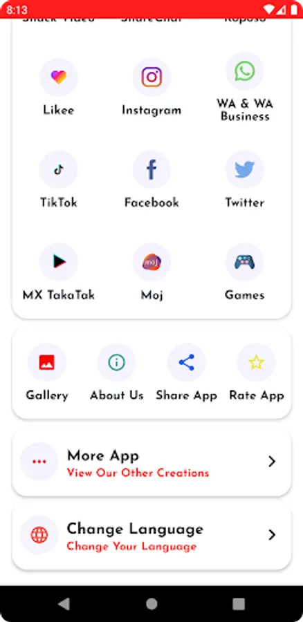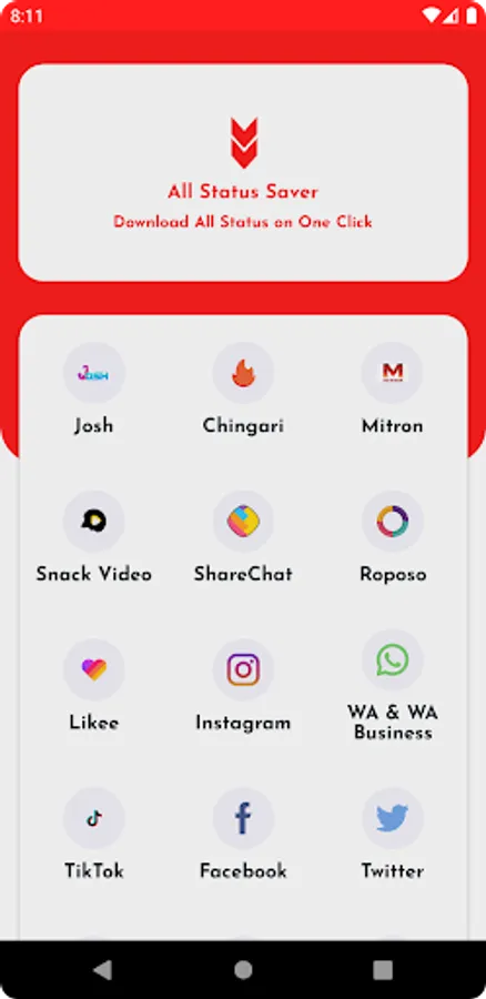 Description : All Status Saver is an Android All Social Media Video and Image Downloader App. You can Save Facebook, Insta, WhatsApp Stories and TikTok, MxTakaTak, Moj, Josh, Chingari, Mitron, Sharechat, SnackVideo, Roposo, Likee, WhatsApp, WA Business, Twitter, and Instagram Videos and Images, Reel with All Status Saver without watermark. You can easily share them from the App.