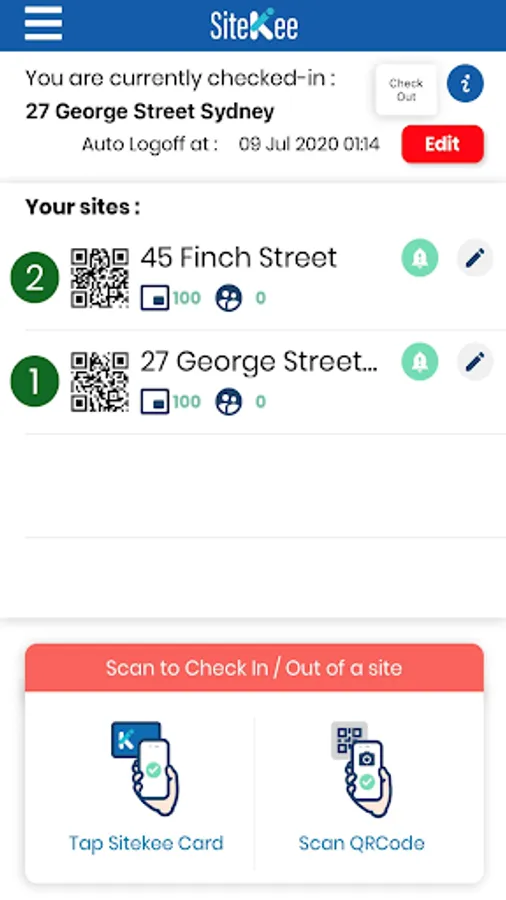SiteKee is a real time system that provides you up to date information to people entering and leaving your registered sites. It will allow you to access their induction and site required documents as they tap in to enter, and will alert you of any documents they may have which may have expired. Multiple areas can be setup within each registered site. It can also provide safety alerts, such as notification to present first aiders along with emergency details ,when alerted, evacuation notification if required. Site hours can be tracked, this information can be used for future estimating,or invoicing.