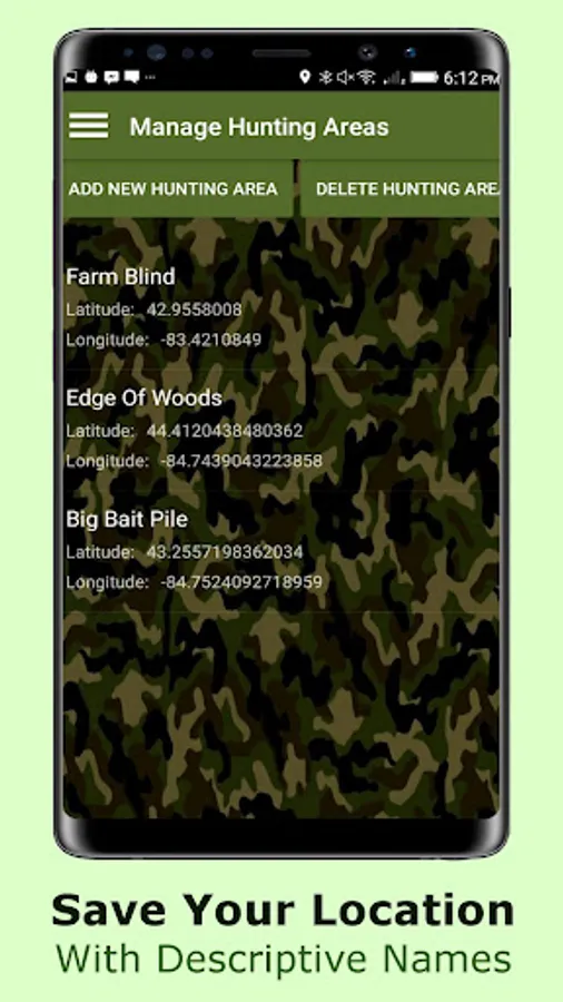 Add unlimited locations. Also add the location of your vehicle just in case you get turned around in the woods. When you tap the ADD NEW HUNTING AREA button, a screen with two tabs will appear:"
