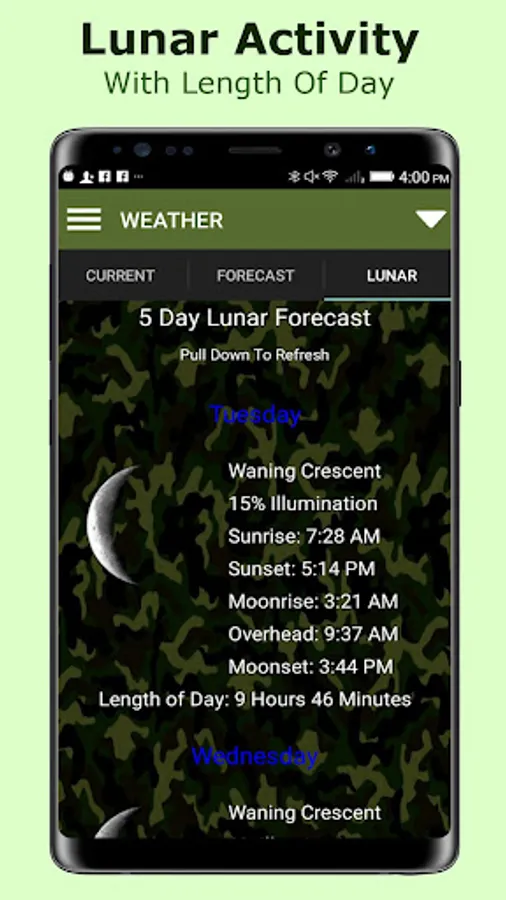 LUNAR tab displays the 5-day lunar activity in either 12 or 24 hour time format, depending on your settings. Combined together, this data is a great indicator of deer or other game activity and the probability of seeing movement.
