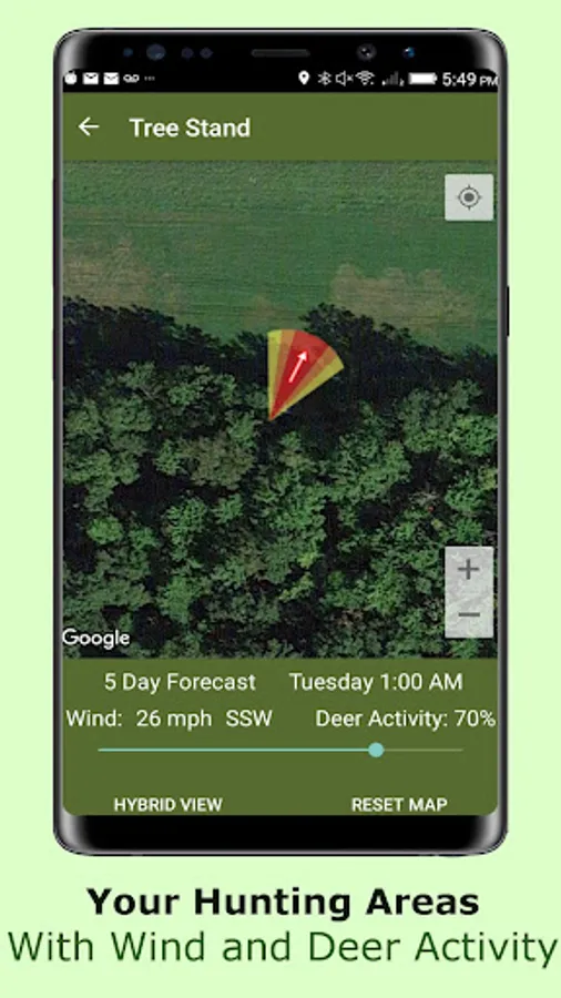 Show location on map will bring up the map of the location. If the scent indicator is not in the precise position of your choosing, just hold your finger on it until it is draggable, then drag it to the exact location. The slider at the bottom of the map can be dragged to display the wind speed and direction, along with the deer activity for any time during the next 5 day period. The Button at the bottom cycles through your choice of Street, Hybrid, or Satellite views.