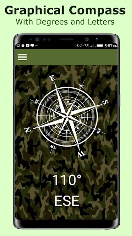 Compass image with standard compass needle points, digital readout with the bearing in degrees, alphabetic symbols with compass needle heading. A must-have for hunting apps!