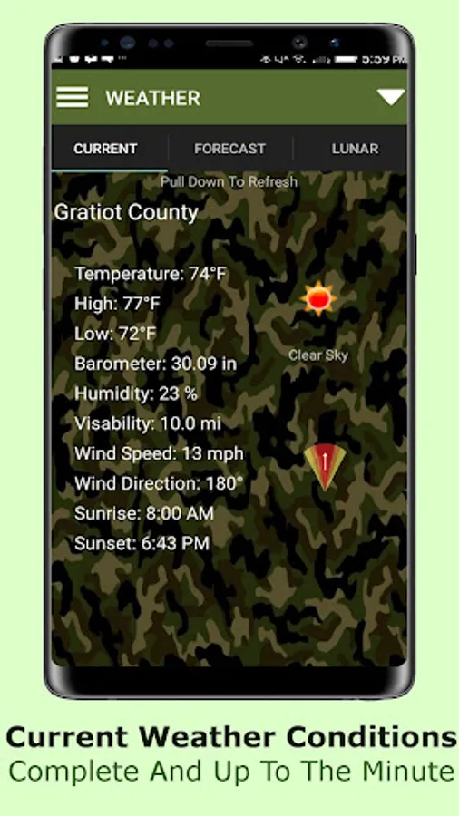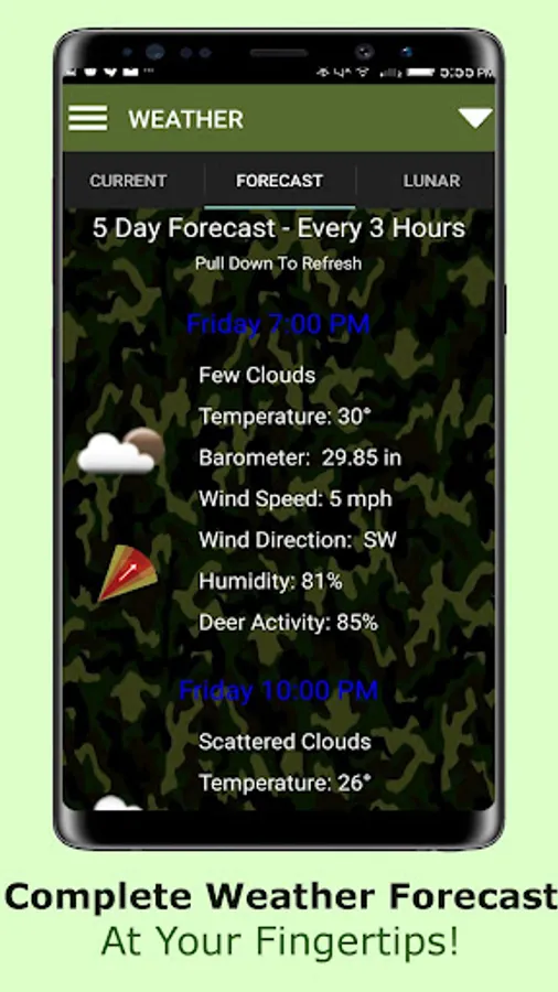 CURRENT tab displays the current weather in either standard or metric. Notice the SCENT INDICATOR, the same one you'll see on your HUNTING LOCATION page. By tapping the DOWN ARROW in the upper right corner, you can choose which location you'd like the weather to show.