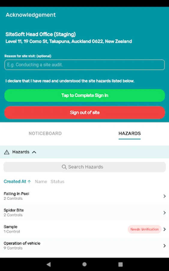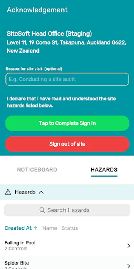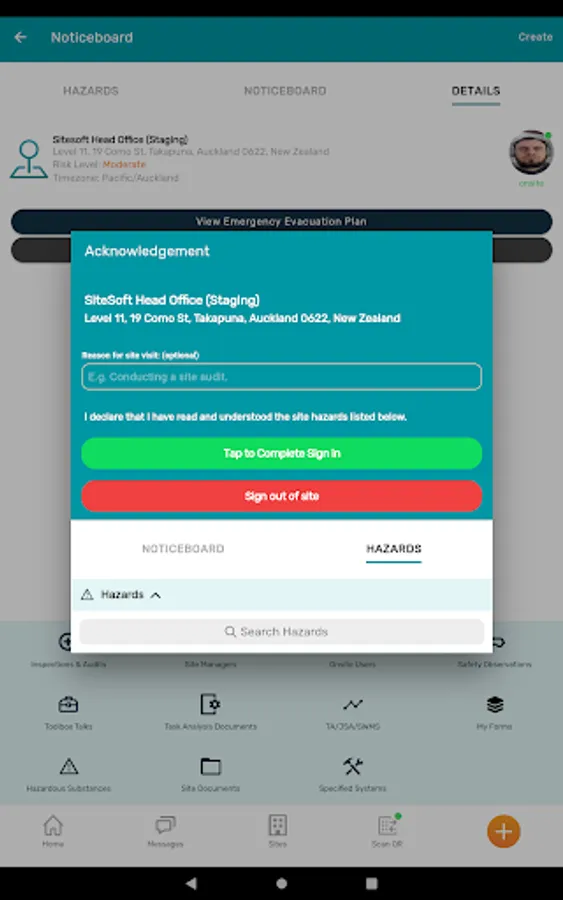 SiteConnect is a health & safety and contractor tracking technology. It includes site inductions for contractor compliance, hazard register, incident register, task analysis register, hazardous products register and an emergency response plan register. New features include tasks, contractor pre-qualifications and site audits. The app uses GPS capabilities and QR code scanning technologies to provide contractors with relevant site inductions and site hazard information. Site Connect is a product developed by SiteSoft New Zealand Ltd.