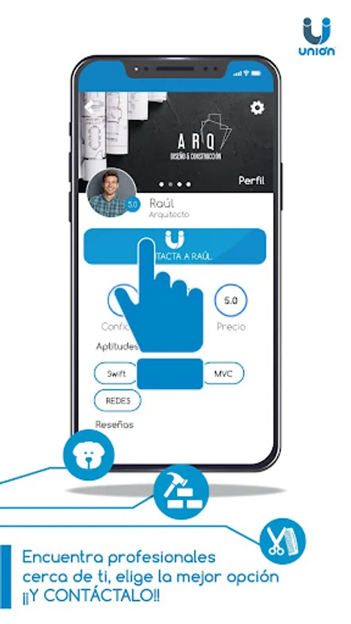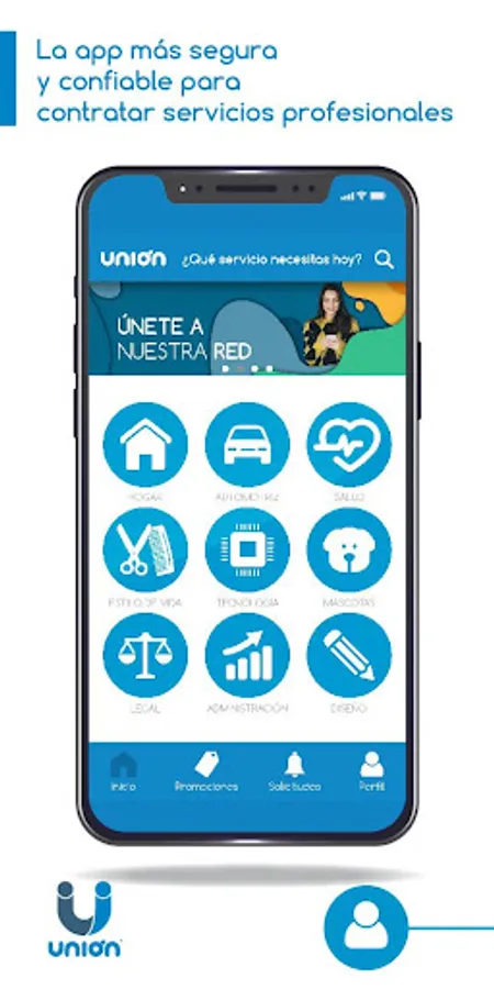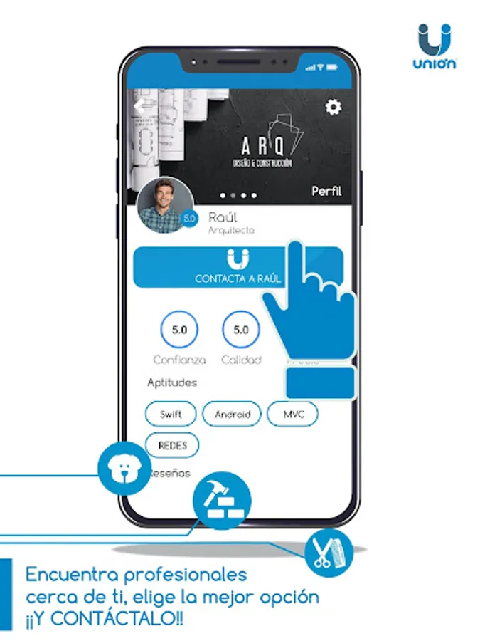 Register as a user, it's free. Search for professionals through our app, union organizes professionals through categories, this will make your search more effective, you can also review their skills and assessments so that you choose the best option for you.