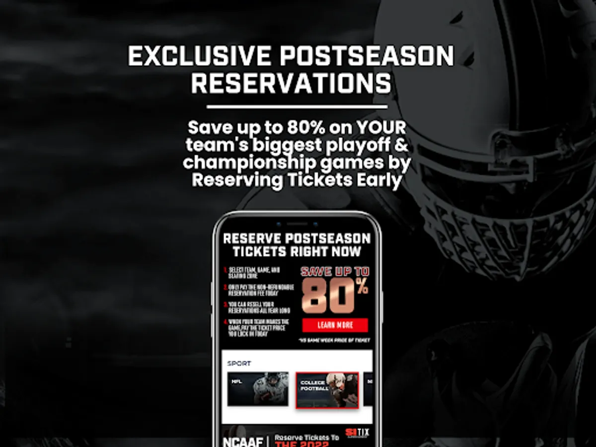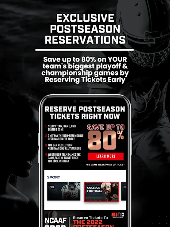 SI Tickets' exclusive postseason marketplace empowers fans to buy and sell postseason ticket reservations to see their team in the biggest games. We offer reservations in the NFL, NBA, MLB, NHL, College Football and College Basketball. Choose the team, seating zone, and the number of tickets. Pay a reservation fee and lock in a ticket cost. Then when your team makes the game, you don't have to worry about securing your seats to the biggest game of the year.