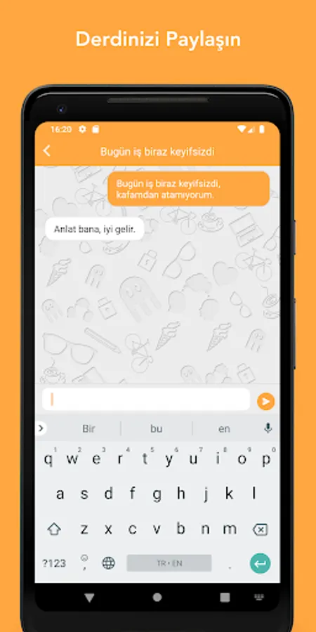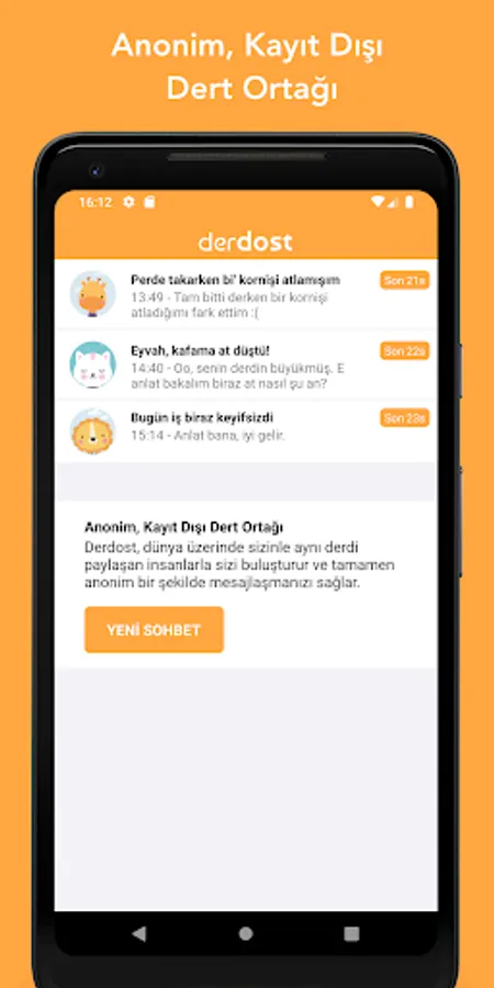 Derdost allows you to chat anonymously with people around the world who share the same concerns with you. Derdost does not ask for personal information in any way, it always protects your anonymity.