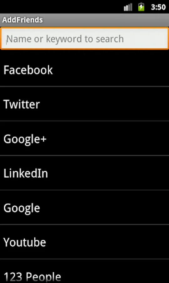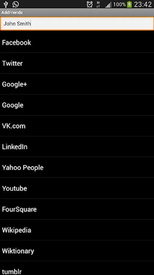AddFriends works with for example Wikipedia, Wiktionary, Facebook, Twitter, Google+, Google, Yahoo, LinkedIn, FourSquere, Youtube, VK Vkontakte, tumblr, Pinterest, Flickr People etc.