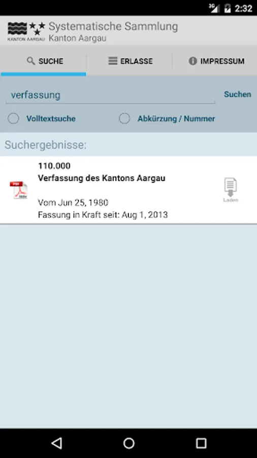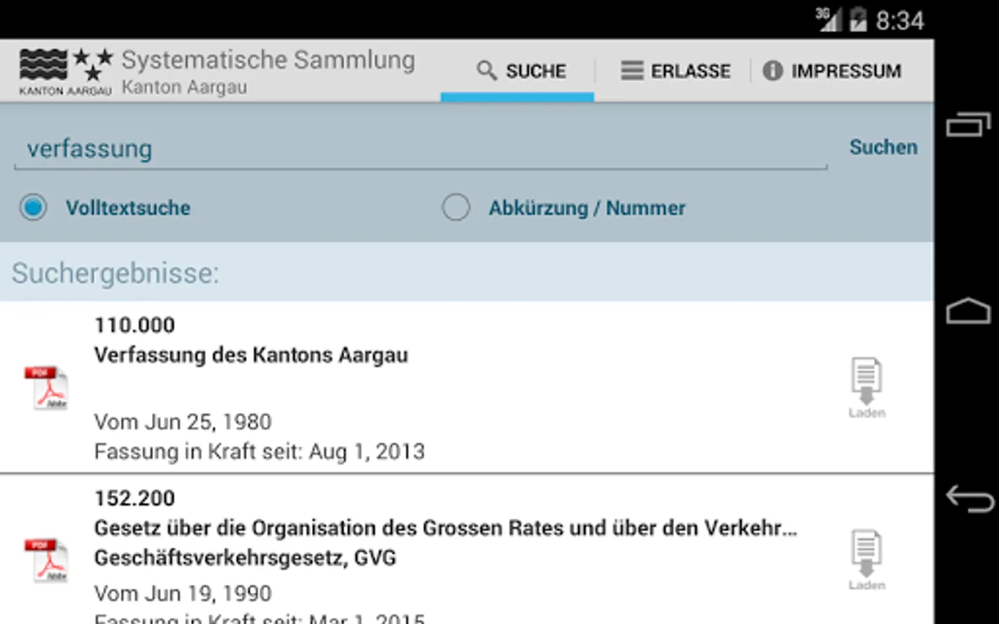 Decrees can be found using a full text search or by the abbreviation / systematic number and displayed as a PDF. If necessary, the PDF files can be stored in the app so that they are available even without an Internet connection.