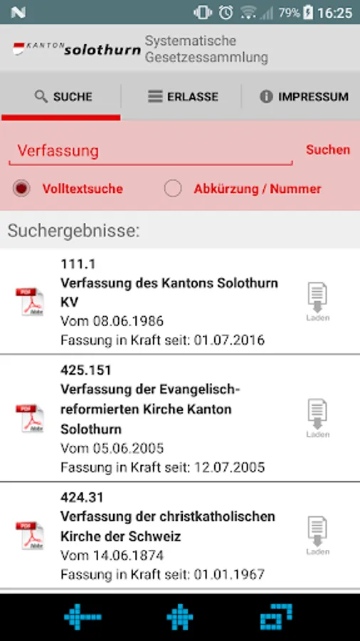 Laws are found by full-text search, with the abbreviation or the systematic number and displayed in PDF format. All PDF files can be stored locally for offline use.