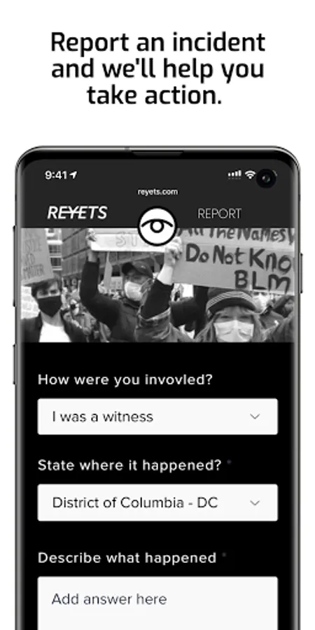 Reyets is a mobile smart app paired with an AI powered database. The Reyets app lets people know their rights, document abuse and get help. Incidents reported through the app are fed into the Reyets dashboard that serves as an AI powered analysis and record keeping database. Data is then analyzed and used to support investigations into misconduct, help write better policies, and used by public defenders to support witness accounts in court.