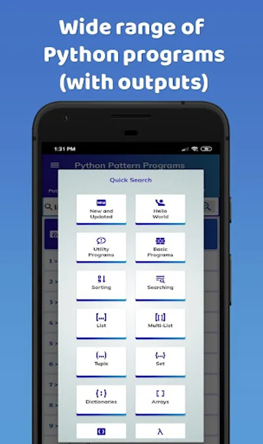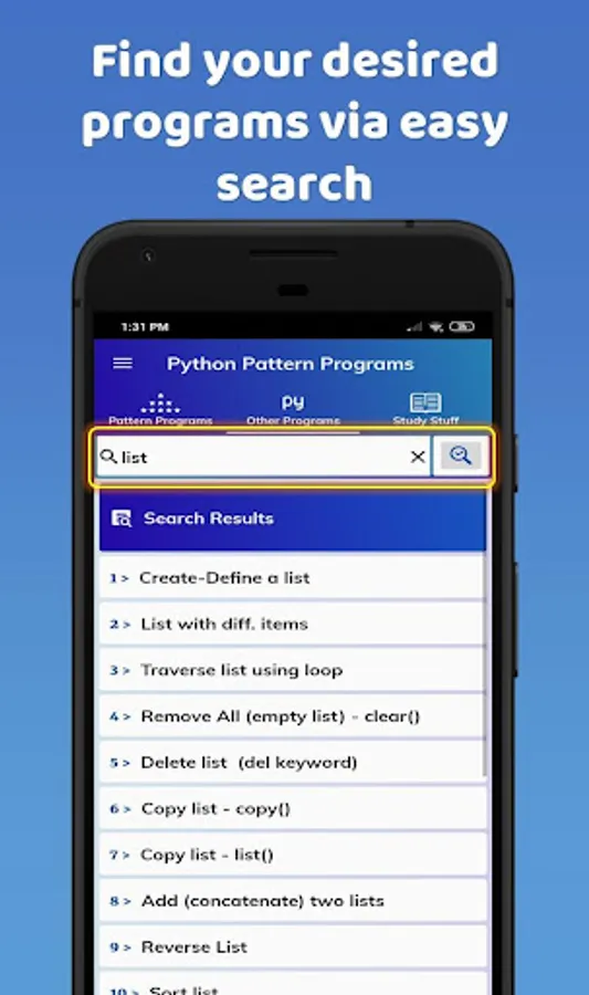 This app is full of pattern and other Python programs. In addition to this, there is a lot of study stuff related to Python programming as well.