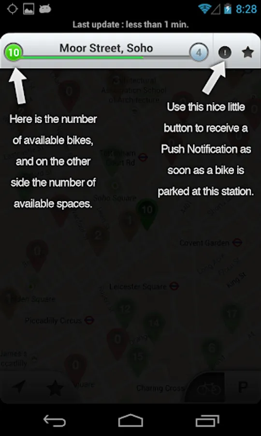 But the most awesome feature of Univelo is the available bike push notification. The idea is simple: you can select stations you wish to receive a notification when a bike is pushed in. So you can do your daily yoga (or go grab some pizza) and just leave when you receive the notification.