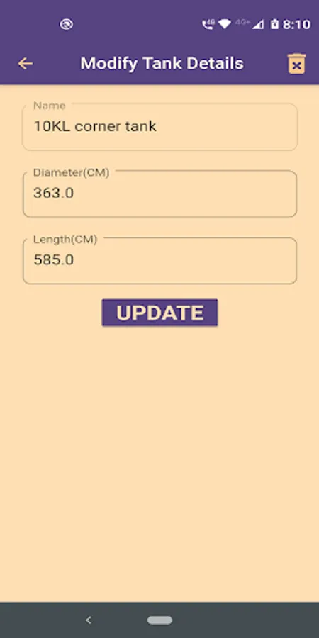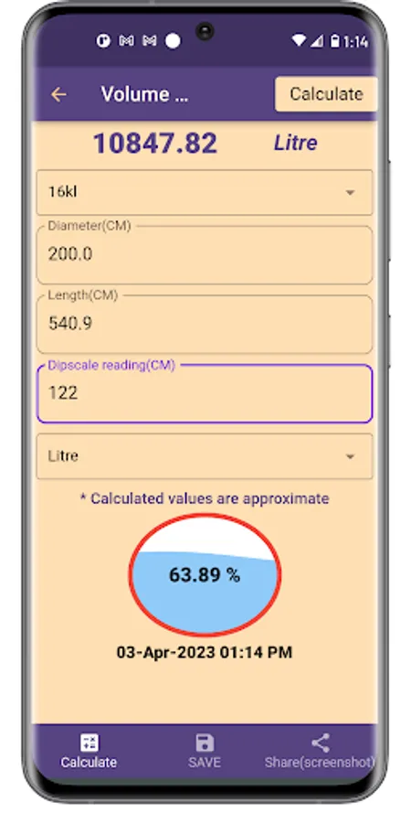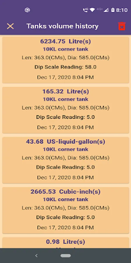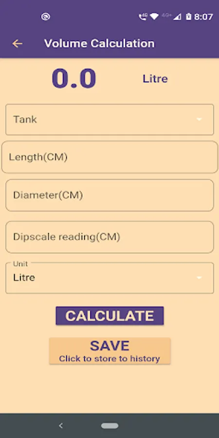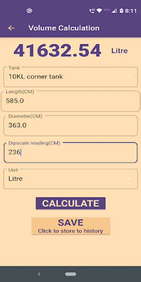 -- Store your calculation to volume calculation history with volume, unit, tank