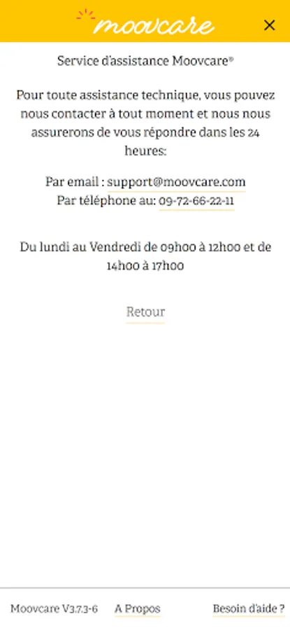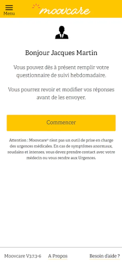 Moovcare® est facile d'utilisation : une fois par semaine, vous recevez le questionnaire dans votre boîte mail personnelle ou via une notification si vous utilisez l’application mobile. Vous devez simplement avoir à votre disposition une connexion Internet ainsi qu’une adresse e-mail.