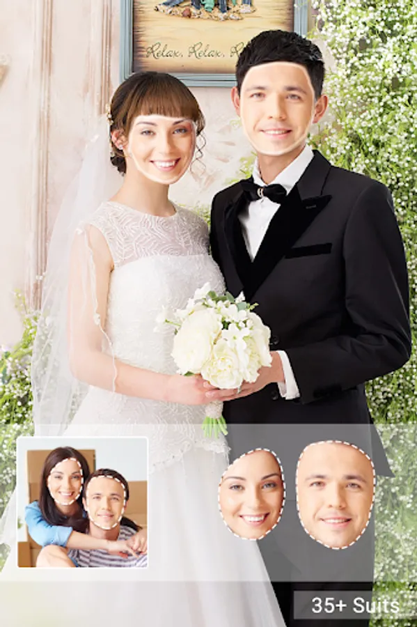 beautiful Suits and Dresses with your married couple on a Photo. This application has world famous 35+ beautiful wedding photos which you can set with your photos and get newly photography lovers effect like those were taken lovers editors within those places marriage pictures .